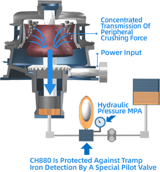 Automatic control of cavity clearance; Intelligent adjustment of ore discharge port, tramp iron detection; Single cylinder hydraulic system, high crushing force.