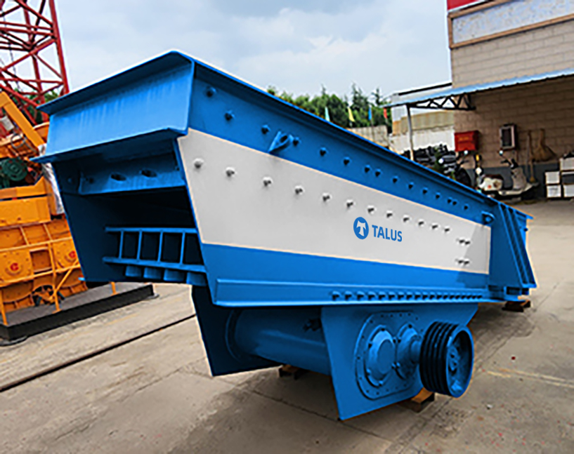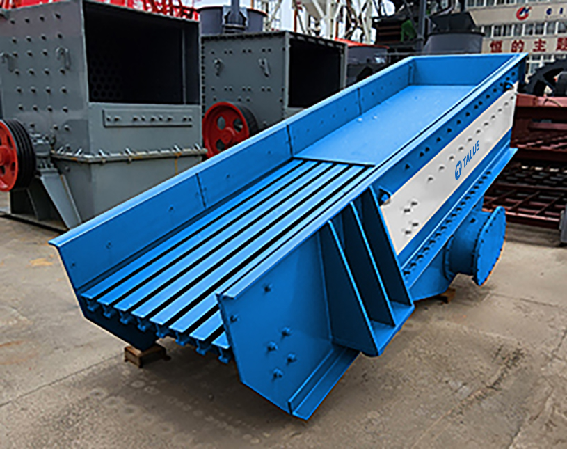 The vibrating feeder, also known as a pan feeder, is located in the front section of the primary crushing equipment. It is used to feed block and granular materials from the storage bin into the target production device evenly, regularly and continuously. The feeder also has a coarse screening function, removing soil and impurities from the materials and controlling feeding amount to match the processing capacity of subsequent crushing and screening production line. It is a necessary equipment for the complete production line with characteristics of sturdy structure, impact resistance and durability etc. It is used in crushing and screening combined equipment of metallurgy, coal mining, mineral processing, construction materials, chemicals, abrasives and other industries.